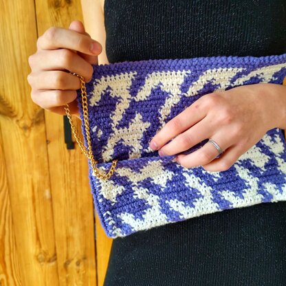 Easy to follow crochet pattern of a unique, elegant clutch with houndstooth motif.