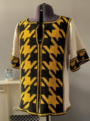 This crochet pattern is for a striking menswear tunic, with a bold houndstooth pattern. The design includes oversized shoulders, half length sleeves and a V Neck held together with a toggle. The tunic is designed using DK cotton yarns to keep the wearer cool.