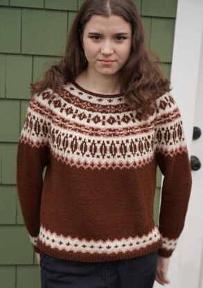Huakaya (pronounce wa-KA-ah) alpacas are prized for their amazingly soft and fluffy fleece. Alpaca fiber is smoother, warmer, and lighter than sheep’s wool, making for a truly luxurious garment. The fiber takes to dying remarkably well. This pullover was worked in four shades (two natural and two hand-dyed) of alpaca. The construction is top-down with short rows worked in to elevate the back neck. Classic fair isle patterns along the yoke, lower edging and sleeve cuffs are featured.