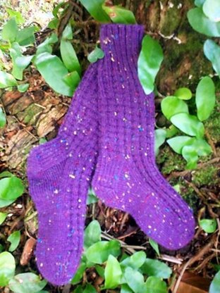 Hand-dyed, painted and variegated sock yarns are often so colorfully busy that any knitting stitch patterning simply disappears. These special yarns require a more simplistic approach such as the easy knit and purl combination used in these socks. The bonus is that this patterning makes a stretchy sock that wants to hug your leg and foot. Heel construction is the traditional flap & gusset method.