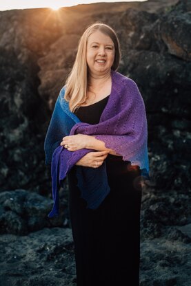 This triangular shawl is designed to be a gentle, soothing knit. It consists of mostly garter stitch, interrupted at even intervals with 2 rows of lace. It is finished off with a beautiful border of delicate twisted rib cables and more garter stitch. Finally, the bind off edge has a picot detail to complete the look.