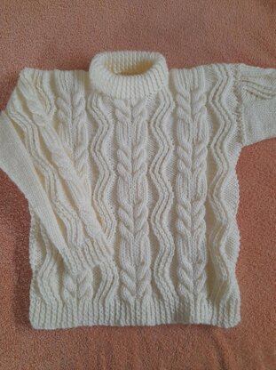 Crew neck aran jumper with ribbed edging and zig zag and cable panels, age 5-6 years, 26-28” chest, 17" length, 12" sleeve Suitable for boy or girl