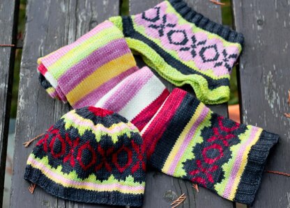 I have always loved intarsia, and designing this set was a perfect opportunity to use my favorite technique. The Fair Isle chart I am using throughout is simple enough for a beginner, yet interesting enough for a well-practiced knitter. Each piece is knitted in the round and is completely seamless.