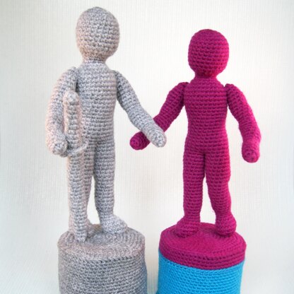 With this pattern you can make a basic human figure which you can alter and accessorize as you wish. It is a fairly simple, non-gendered shape with no features, but with shaping on the body and limbs, and more in proportion than amigurumi usually are. You can insert pipe cleaners/wire to make it poseable, and you can attach it to a base so it can pose like an artist’s manikin or a statue (I have also included details to make a sword).