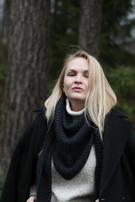 This uniquely constructed shawl is shaped into a modern triangle. The unusual rhythm of increases and decreases creates a distinct shape with a central dip, preventing bulky folds at the throat once you wrap it around your neck. It fits beautifully when draped over your shoulders or transformed into a cozy snood. Hustka shawl is finished with a clean edge along the wingspan, highlighting the graphic and voluminous beauty of the half fisherman rib.