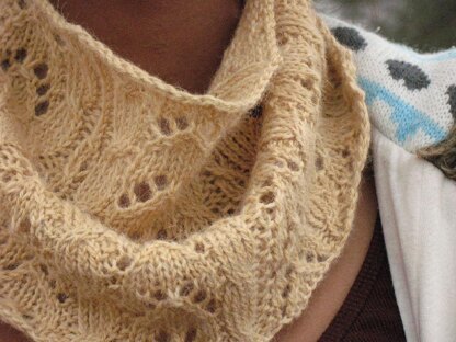 The Hyacinth Neck Cozy is covered with alternating twisted-stitch cables and lace panels. Make yourself one with DK weight yarn on US size 6, 16" circular needles. It also helps to have a stitch marker and a cable needle. The project starts at the lower edge in the round and decreases in circumference toward the top for a snug fit just under the chin