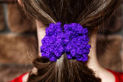 This fun little hair accessory adds a playful touch to any ponytail. The stitches are cast on directly to the hair tie and worked in the round. A modified picot bind off leaves a textured edge that resembles a hyacinth flower when worn. This scrunchie is a great stash buster. Quick and easy, it makes a great handmade gift.