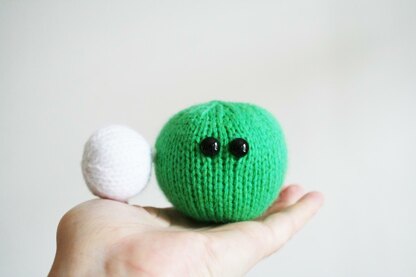 What you will need: 2 knitting needles (US3/3.25mm or as per tension advice),10-15g green DK yarn (e.g. Sirdar Snuggly DK 480 ‘Cutie Clover’), 5g white DK yarn (e.g. Sirdar Snuggly DK 251 ‘White’), 2 black plastic toy safety eyes (9mm), Polyfil toy stuffing, 1 tapestry needle for finishing