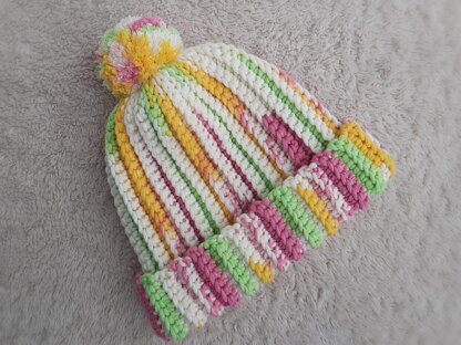 It’s a beginner friendly pattern that involves no increases or decreases. Beanie is worked flat in a rectangle, then the sides are sewn together and the top is closed.