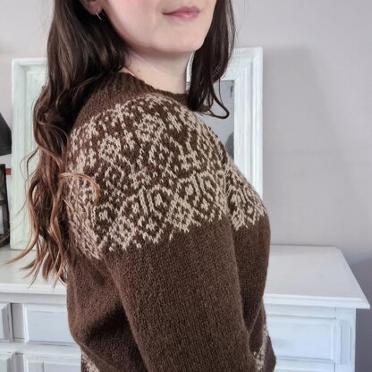Techniques used : Top down yoke sweater knitted in the round / Stranded knitting with two colours per round and no floats to catch / German short rows for the back of the neck / Simple increases and decreases / Twisted ribbing / Straight body, tapered sleeves / Optional German short-rows bust darts (based on Cup size) / Pattern includes charted instructions