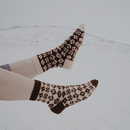 They are knitted top-down and in the round, featuring a stranded colourwork motif throughout. The heels are knitted using the afterthought heel technique. You can choose to “mismatch” your socks as shown in the photos or knit two identical socks. It includes sizes for children, teens and adults.