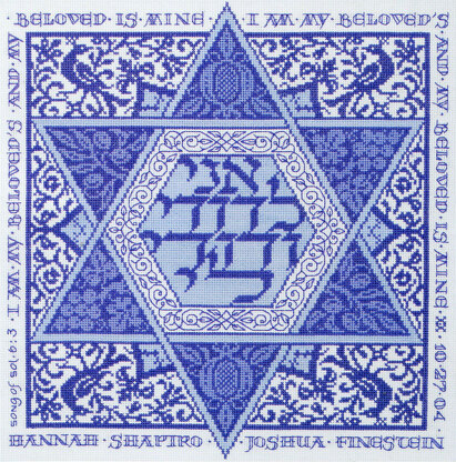 By Sandy Orton. We are proud to offer this wonderful Judaica design by Sandy Orton. This design has the classic quote from the Song of Songs, “I am my beloved, and my beloved is mine”, and has an alphabet included for personalization as an heirloom wedding announcement. One of our most ornate and classically elegant designs in a monochromatic theme of beautiful blues is once again available.