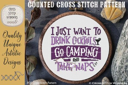 A wonderful saying for any CAMPING enthusiast!\nI Just Want To Drink Cocktails (or Coffee, Tea, Wine, Beer) CAMPING and Take Naps!\nIncluded in chart are five beverages and also five color combinations for you to choose from.\nOriginal and licensed artwork by Funky Frog Creative Designs.\nCross Stitch Pattern designed by Marcia Manning.\nDesign is 100 stitches wide by 90 stitches high.\nPDF is a Black and White counted cross stitch chart which lists suggested DMC floss colors, and includes color pictures.\nStitched design size is as follows:\nSize 11 count: 9.09 x 8.18 inches or 23.09 x 20.78 cm\nSize 14 count: 7.14 x 6.43 inches or 18.14 x 16.33 cm\nSize 16 count: 6.25 x 5.63 inches or 15.88 x 14.29 cm\nSize 18 count: 5.56 x 5.00 inches or 14.11 x 12.70 cm\nSize 22 count: 4.55 x 4.09 inches or 11.55 x 10.39 cm