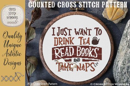 A wonderful saying for any READING enthusiast!\nI Just Want To Drink Tea (or Beer, Coffee, Wine, Cocktails) READ BOOKS and Take Naps!\nIncluded in chart are five beverages and also five color combinations for you to choose from.\nOriginal and licensed artwork by Funky Frog Creative Designs.\nCross Stitch Pattern designed by Marcia Manning.\nDesign is 100 stitches wide by 90 stitches high.\nPDF is a Black and White counted cross stitch chart which lists suggested DMC floss colors, and includes color pictures.\nStitched design size is as follows:\nSize 11 count: 9.09 x 8.18 inches or 23.09 x 20.78 cm\nSize 14 count: 7.14 x 6.43 inches or 18.14 x 16.33 cm\nSize 16 count: 6.25 x 5.63 inches or 15.88 x 14.29 cm\nSize 18 count: 5.56 x 5.00 inches or 14.11 x 12.70 cm\nSize 22 count: 4.55 x 4.09 inches or 11.55 x 10.39 cm