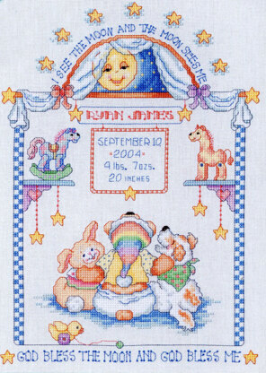 Designed by: Linda Gillum. Stars and Moonbeams gather to celebrate the newborn's arrival! The heart-warming man-in-the-moon looks down in happiness at the birth of a star. "I see the moon and the moon sees me...God bless the moon and God bless me" all together in baby's room in anticipation of baby's arrival.