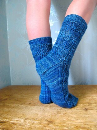 These socks are knitted with The Knitting Goddess Take 5 Sock Yarn 75% superwash merino. 25% nylon. Take Five colourways give you 5 x 20g skeins, each set of 5 skeins gives you approximately 100g / 425m. It can also be knitted with one colour as per the photo, which uses 1 skein of Fyberspates Vivacious 4ply in Deep Aqua.