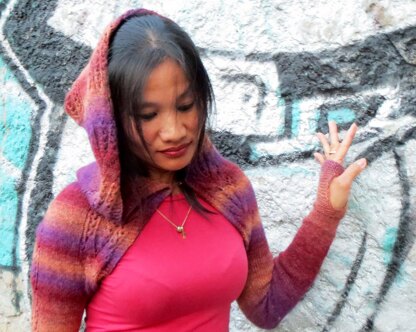 Sleeves are worked seamlessly in the round to the wrist and over, to end like fingerless mitts. The thumb opening can also be used to secure sleeves if the shrug is worn like a cowl (with sleeves used as a scarf).