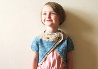 This sweet Child’s shrug is worked from the top down, beginning with the collar. Short rows are worked to shape the neckline; the short sleeves and body are worked in the round. The edging is picked up and worked in one piece.