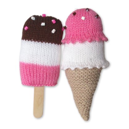 Knit some sweet Ice Cream Treats - an ice cream cone with 2 scoops, and an iced lolly (or popsicle). Designed by Amanda Berry @fluffandfuzz, these toys are knitted in acrylic DK yarns on single pointed needles (not in the round). The ice cream uses a frilled cast on technique and a three needle join, and the lolly uses knitted stripes and Kitchener stitch grafting. For confident beginners and above, other techniques used include casting on and off, knits, purls, increases and decreases, and seaming to finish. The ice cream is 8.5cm wide x 21cm tall, and the lolly 12cm tall x 8cm wide (not including the stick).