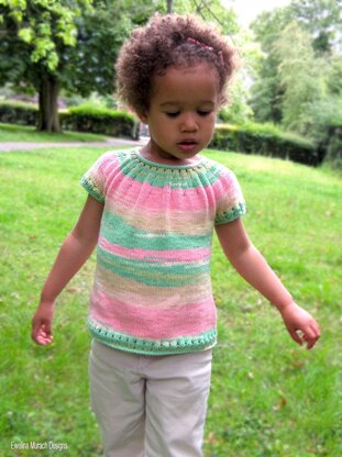 Ice Lolly is an easy and fast knit, and the simple design works well with self-striping and hand dyed yarns. It is seamless and worked from the top down, with an i-cord neckband and short rows used to raise the back of the neck. There are two sleeve length options - long and short.