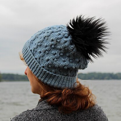 When winter draws towards a close in northern Michigan, the US Coast Guard sends icebreaking ships through the frozen straits to clear the shipping lanes. These large ships break through the thinning ice, leaving flowing water and large chunks of ice in their wake. Here I have illustrated this in stitches, with columns of flowing stockinette cables and floating bobbles peeking out from a reverse stockinette stitch background.