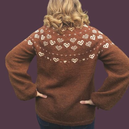 Iced Hearts is worked from the bottom up to the underarms, the sleeves are then worked up to the underarm, joined to the body and the yoke is worked up to the neck edge, working optional short rows into the colour work design.