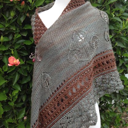 This is an asymmetrical shawl in DK weight yarn, Sport and Fingering also suitable for smaller size. Techniques used in this pattern include creating stitches along side of lace border edge eliminating the need to pick up and knit stitches (this is a fun technique that adds to the design); A twisted wrap stitch; Front and Back Cross stitches, aka Traveling stitches; Attaching beads; Motif and Lace work. Below you will find links to some of these techniques. Pattern includes 336 6/0 glass beads Myuki #F463k. Beads will be applied on both colors. If you don’t wish to include beads, just knit that stitch. I am a tight knitter so please do gauge or buy extra yarn. Group Hands On Knitting CenterVideo tutorials; Creating stitches along lace edging; https://www.youtube.com/watch?v=OLUexQGhZE0 Twisted wrap stitch; https://www.youtube.com/watch?v=j8YzlRzqsfI Working Back cross and Front cross stitches without a cable needle (traveling stitches); https://www.youtube.com/watch?v=aqFGgIgETN0