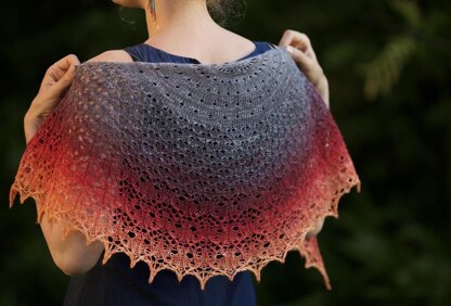 Igni is a striking shawl with a simple pattern of dotted rays expanding out through the yoke shifting to a textured stitch which transitions smoothly into rich lace.