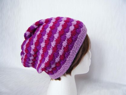 This slightly slouchy hat, is worked in the round in an easy-to-knit textured pattern. Interlocking diamonds are created in wide stripes of color with a Tuck Stitch knit into the stitch several rounds below the needle while releasing the stitches above. Only one color is used at a time. Use three colors for stripes as I have here, change it up by using only one or two colors or make it multi-colored by using up your scraps.