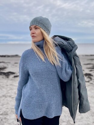 The pullover is worked from the top down with a seamless hybrid shoulder. First, the upper back is knit flat, shaped with increases, and left on hold. Stitches are picked up for the front shoulders, which are worked flat separately. Then the front and back shoulders are joined up to knit the yoke in one, and stitches are picked up along the shoulder edges for the sleeves. When the yoke is complete, the body and sleeves are separated and worked in the round to the bottom. The collar is picked up and worked circularly. The pattern is included in two length versions: regular and long. The extended version features asymmetrical slits along the hem to prevent the hem from stretching during wear.
