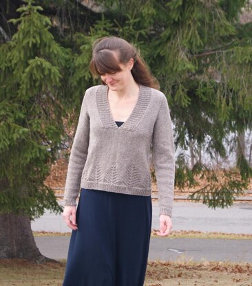 Finished Measurements at bust: 31 (33 ¾. 36 ½, 39, 41 ¾, 44 ½, 47, 49 ¾, 52 ½)” Shown with approx 3” positive ease. Materials:Worsted Weight Woolen Spun by Elsa Wool (100% cormo wool; 4 ounce skein = approx 237 yards) • 4 (4, 4, 5, 5, 5, 5, 6, 6) skeins color Medium Gray • Approx yards needed: 785 (845, 900, 955, 1000, 1075, 1135, 1190, 1265) Needles: • One 29” circular size US 8 (5 mm). • One set double pointed needles (dpns) size US 8 (5 mm). Notions: • Stitch markers • Stitch holder or waste yarn • Tapestry needle