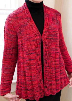 Two yarns together create a light-as-air three season classic with a bit of swing, a few interesting cables and a hidden button for an optional closure.