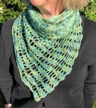 The In The Willow Shade shawl pattern is a simple asymmetrical shawl design using basic treble crochet and chain stitches (UK).