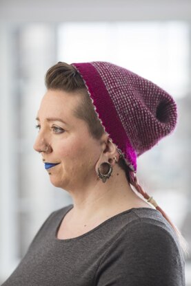 A reversible hat with a box-pleat top, knit in really real jogless one-row garter stripes in the style of Britt-Marie Christoffersson!