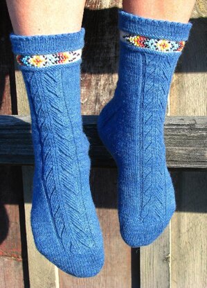 A knitted feather design down the front and a picot edge round out these very dressy and eye-catching pair of socks.