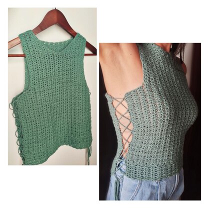 The pattern consists of written explanations and visual diagrams, it is available in sizes S, M, L, XL. The measurements of the top are indicative and are based only on the front and back crocheted part because of the side laces that make the top adapt to your body and be tighter or looser as you prefer.