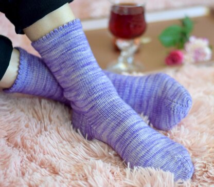 The socks are worked in the round and cuff down. They feature a picot edge, garter stitch highlights on the modified star toe and eye of partridge heel.