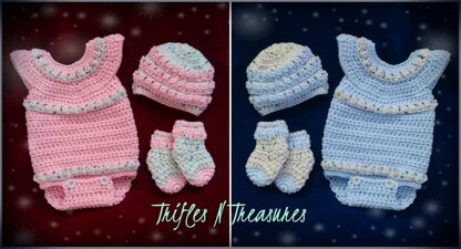 The Infant Romper Set comes complete with hat, romper, and adorable little socks, for your favorite 0-3 month old đ