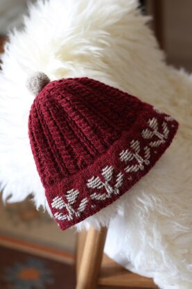 The beanie is worked bottom up seamless in the round and features double layered hem with colourwork pattern on the right side and simple ribbing on the inner side. The body of the beanie is worked in the main yarn held double with a textured cable pattern. The crown is pointed and can accommodate a tiny pompom.