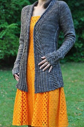 "Ink" is the perfect cardigan to slip on when the balmy days of summer transition to the chilly days of autumn. Named for the color of the yarn, it is also a reminder that autumn brings with it the beginning of a new school year. Knitted in fingering yarn and reverse stocking stitch from the collar down, the cables on the garment bring to mind the V’s of birds flying south for the winter. File contains English, German, and Polish versions!