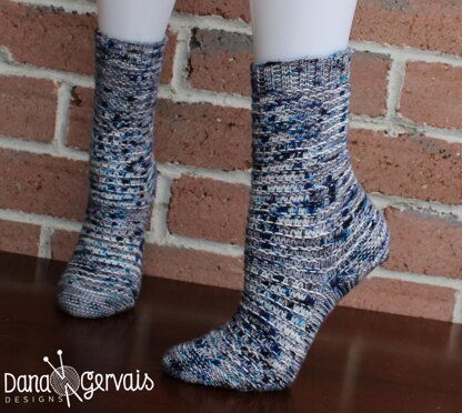This sock is worked cuff down with a reverse stockinette short row heel, princess sole and reverse stockinette toe. This sock has the added feature of being reversible - 2 pairs of socks in 1!