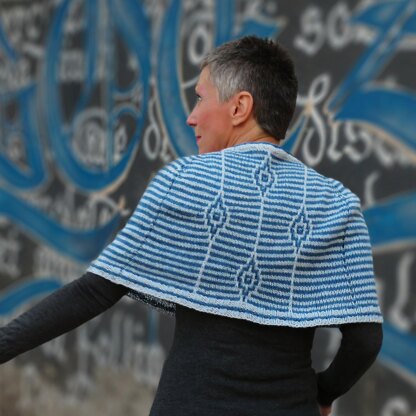Interferenze (Interferences in Italian) is a cape featuring a striking yet easy colorwork pattern, worked with slipped stitches (or mosaic technique) to draw a play of diamonds on a striped background using just one color at a time.