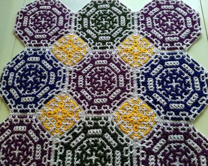 The Interloctagon Blanket Crochet Pattern includes written instructions for both the octagon and the smaller square needed to make the blanket. Both patterns use interlocking crochet in the round and come with full video tutorials to walk you through the process. The octagons measure approximately 10" across, and the squares 5.25".