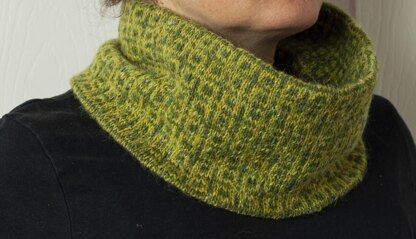 This cowl is based on a repetitive motif playing with intertwining squares and it is worked with two green shades that gives it a subtle tonal effect. The two shades are switched on the second half of the cowl. The cowl is worked in one piece, as it is folded in half and seamlessly grafted, it can be worn on both sides.