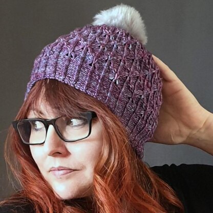 This pretty beanie is created with twisted ribbing and tuck stitches which continue right up into the crown.