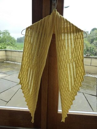 This pattern is for a light summer scarf using 100 grammes (440-460 yards) of fingering or light fingering weight yarn, incorporating simple cables and columns of fagot lace.