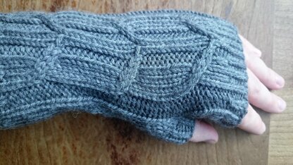 The mitt is intended to be worn with negative ease, as the cable panel stretches significantly. The mitt has a circumference of 6”, when unstretched, at both the palm and wrist and will stretch comfortably to 9” circumference. Additional length is easily added to the mitt should it be desired, just be sure to have extra yardage to accommodate your modifications.