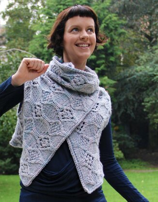 Irena is a stylish and versatile wrap with a surprisingly simple shape. Meandering cables and lace create an alluring all-over texture with an oriental feel.