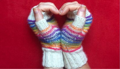 Iridis is the Latin word for Rainbow. These mitts are wonderfully fun and colourful, great to brighten up a gloomy, cold day. The thumb is uniquely highlighted with a single knit stitch border around a purled gusset. Coloured purl ridges also add a lovely texture to the body of the mitt.