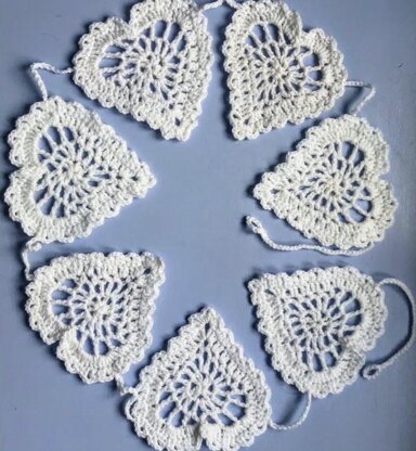 Bunting to brighten your day! Beautiful bunting, with a heart- shaped motif detailed in each pennant! The heart symbolizes, and best expresses LOVE on all levels – It is recognised the world over, as a symbol of love, but also compassion and joy. I love to incorporate hearts into my designs**;** when the pattern is completed, as a gift for a loved one - or for yourself – the heart represents the love that you have poured into its creation. As a perfect ‘pick-me-up’, this bunting is a relatively quick and easy project, a great stash buster and can be gifted to both young and old....And of course, you can mix up your colour ways and tailor your bunting to complement any room! For any occasion! This pattern was exclusively created with an upcoming Wedding in mind!